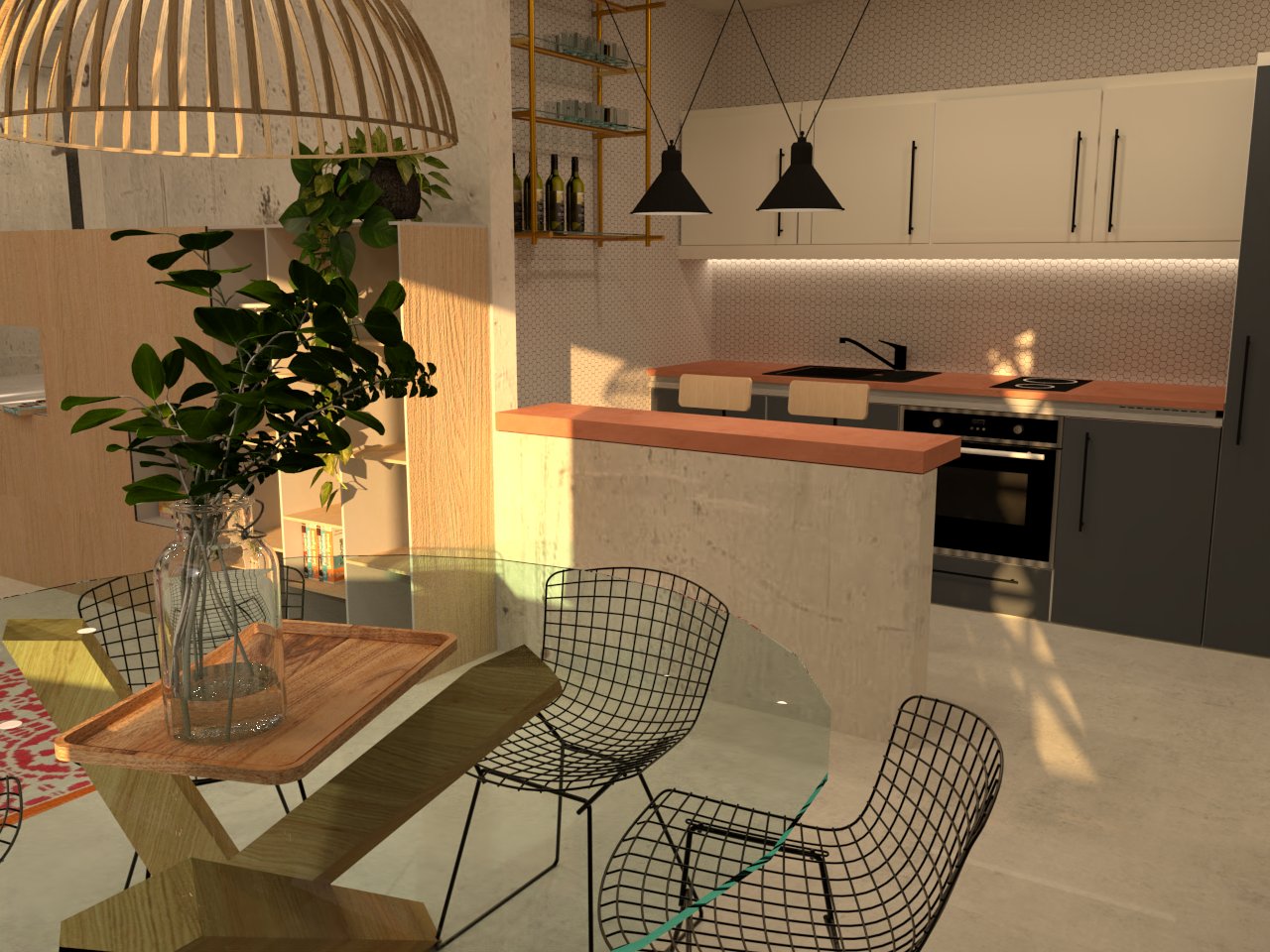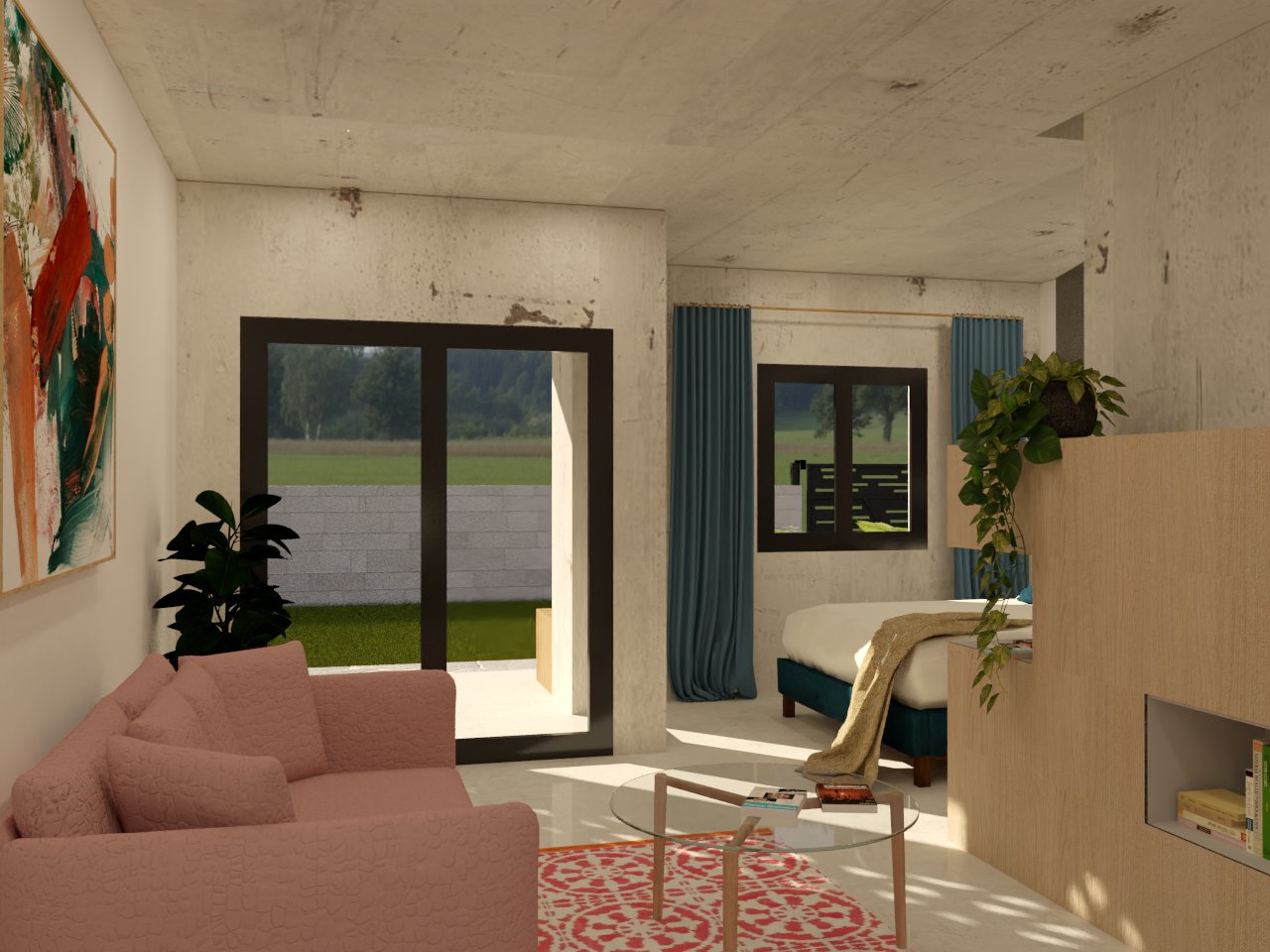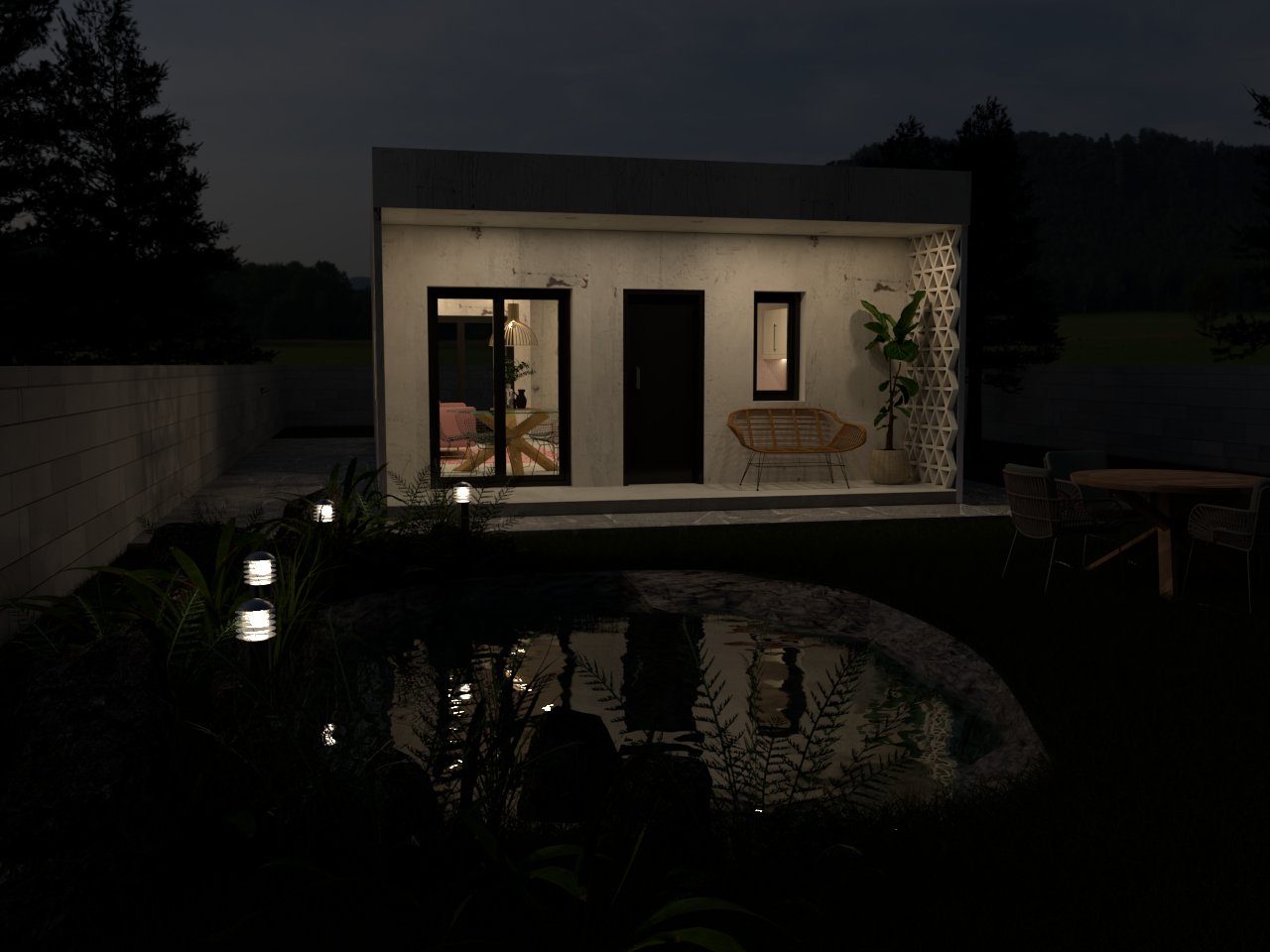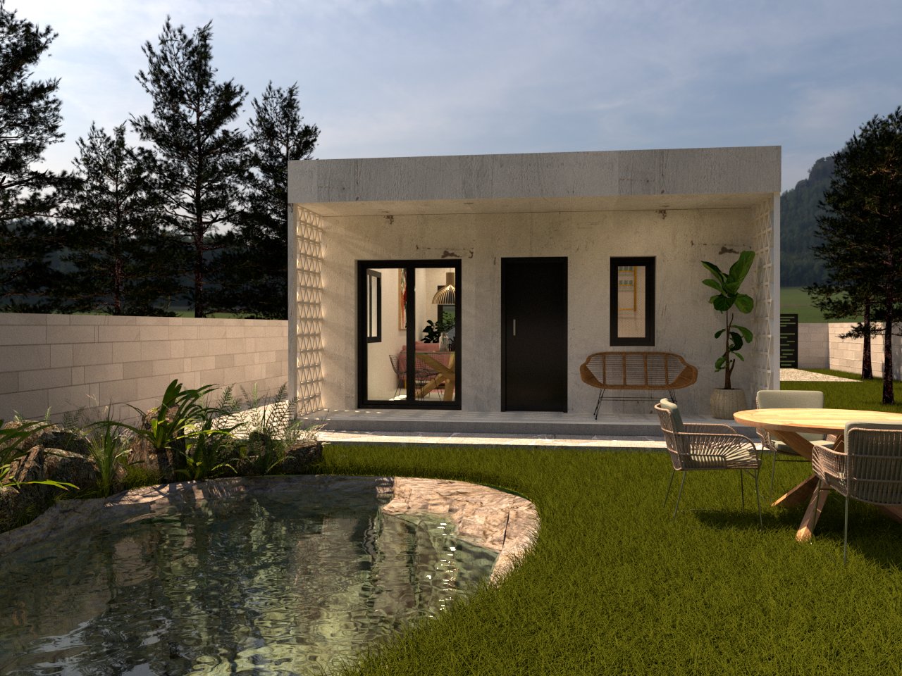 Proyecto de renderizado y diseño de apartamento moderno con amplias ventanas que dejan entrar la luz natural, decorado con muebles que dan calidez y un ambiente acogedor. Desde el interior, se puede apreciar una vista panorámica del exterior, donde se encuentra una hermosa piscina natural rodeada de exuberante vegetación. La piscina tiene un diseño orgánico que se integra perfectamente con el entorno, creando un ambiente relajante y armonioso.