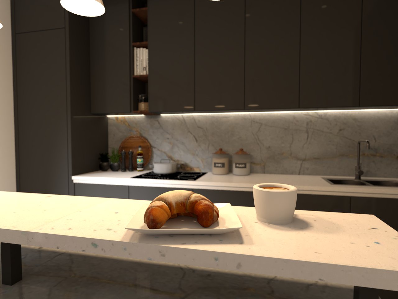 – Iluminación de Tareas: Una tira de luz LED bajo los armarios superiores asegura una iluminación uniforme y funcional en las áreas de trabajo.