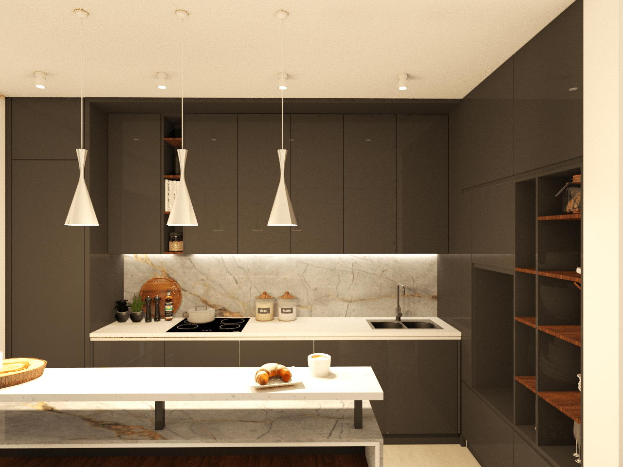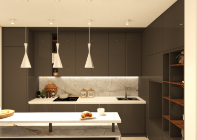 – Estantes Abiertos: Integrados en los armarios, permitiendo un fácil acceso a libros de cocina y objetos decorativos.