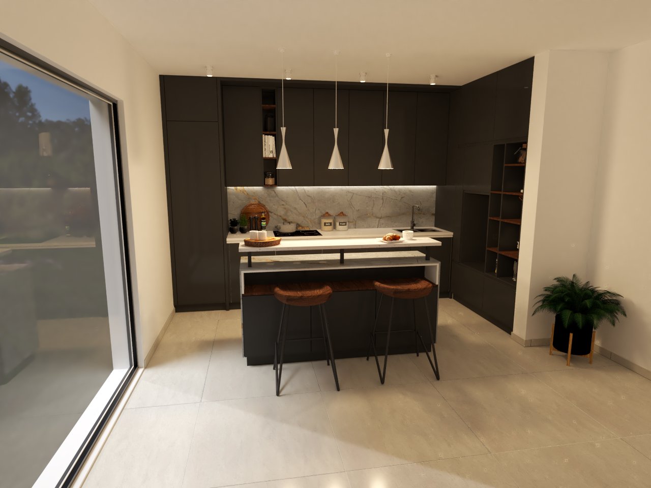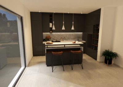 – Isla Central: De tamaño compacto, con una encimera blanca que contrasta con la base negra. Incluye espacio para dos taburetes con asientos de madera, creando un rincón perfecto para desayunos o reuniones informales.
